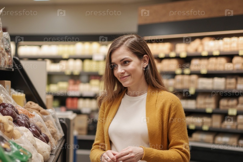 Женщина улыбается, покупая свежие продукты в супермаркете