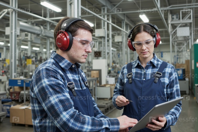 Мужчина и женщина, сотрудничающие с помощью цифрового планшета на фабрике