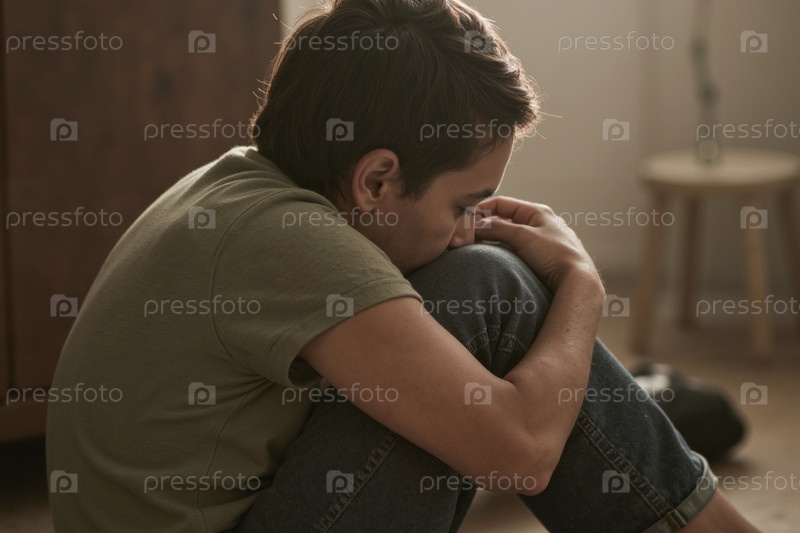 Подросток сидит один, обнимает колени и выглядит грустным