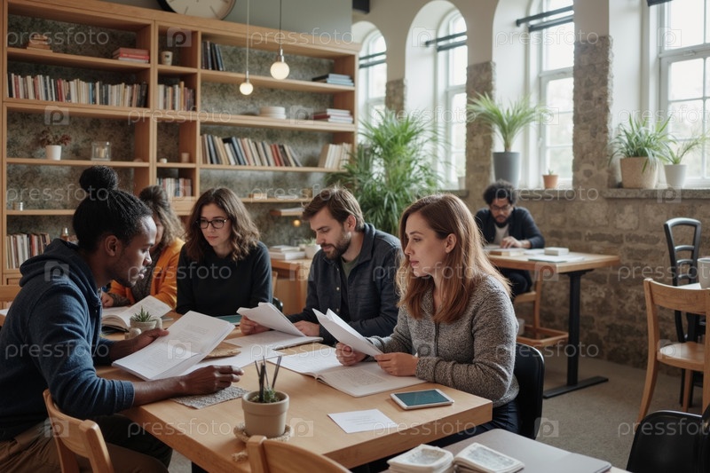 Мультиэтнические взрослые сотрудничают над академическим проектом в библиотеке