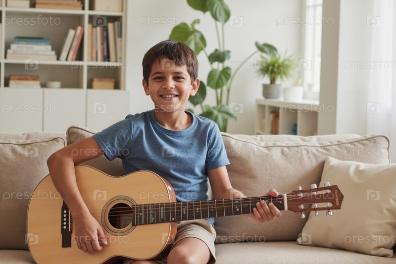 Портрет мальчика, улыбающегося во время игры на акустической гитаре в помещении