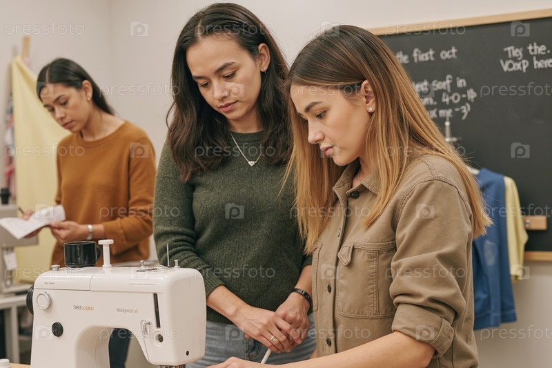 Мультиэтнические женщины, сотрудничающие во время шитья в классе
