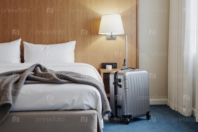 Чемодан стоит рядом с гостиничной кроватью в современном гостевом номере