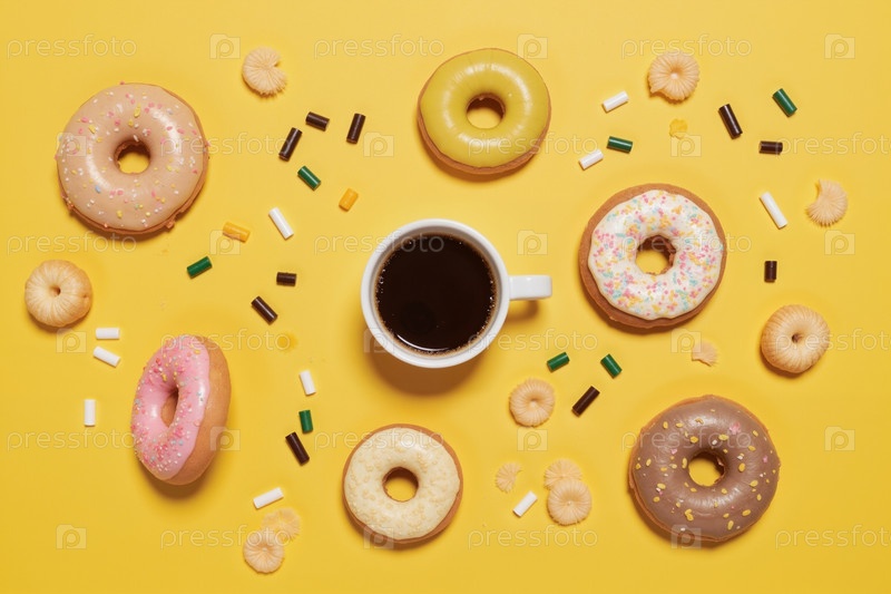 Разнообразные пончики и печенье, окружающие чашку кофе на желтом фоне