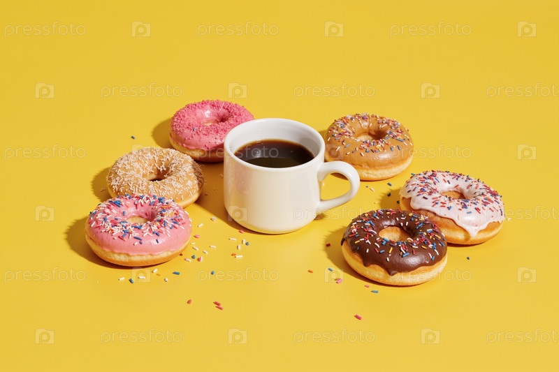 Сортированные пончики окружают кофейную кружку на желтом фоне, создавая сцену завтрака