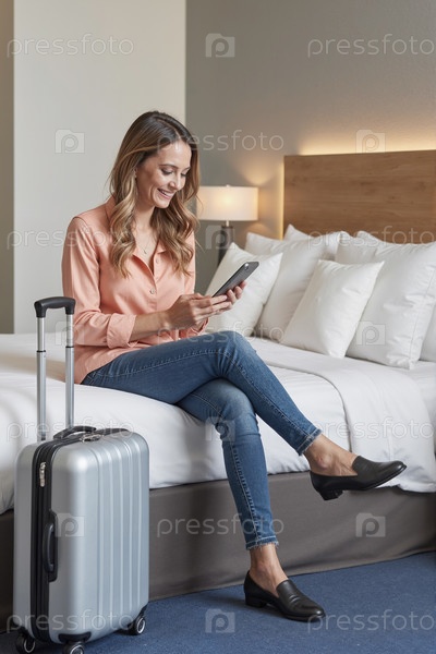 Женщина, сидящая на кровати и использующая планшет во время путешествия