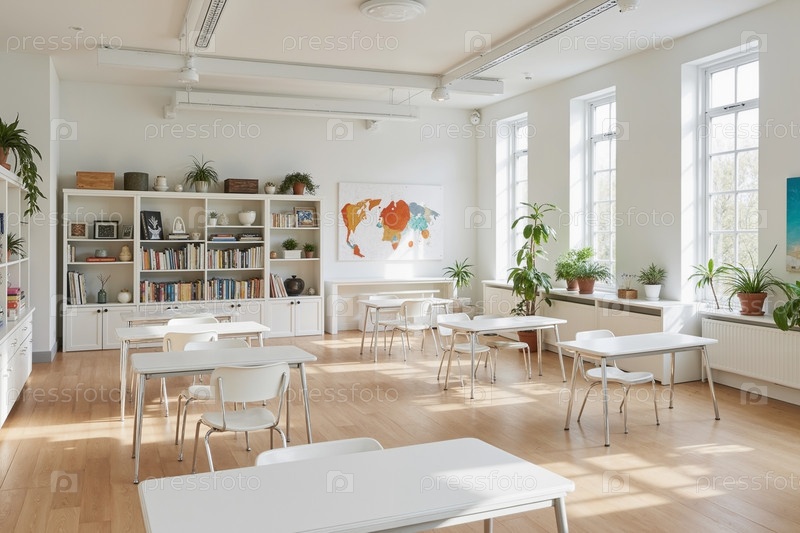 Пустой класс с столами и книжными полками в условиях дневного света