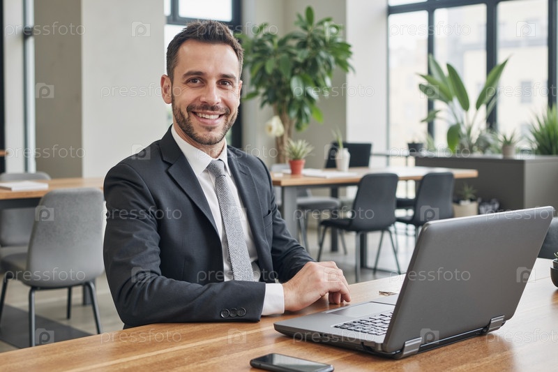 Портрет человека, улыбающегося во время работы на ноутбуке в офисе