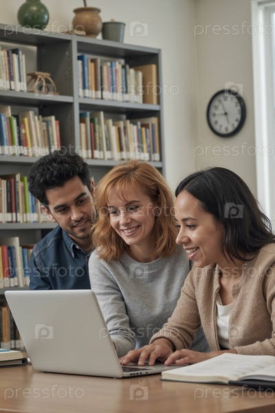 Мультиэтнические взрослые сотрудничают над проектом в библиотечной обстановке