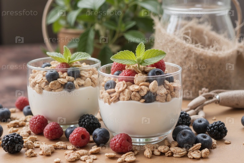 Гранола с йогуртом и свежими ягодами, подаваемые в стаканах на столе