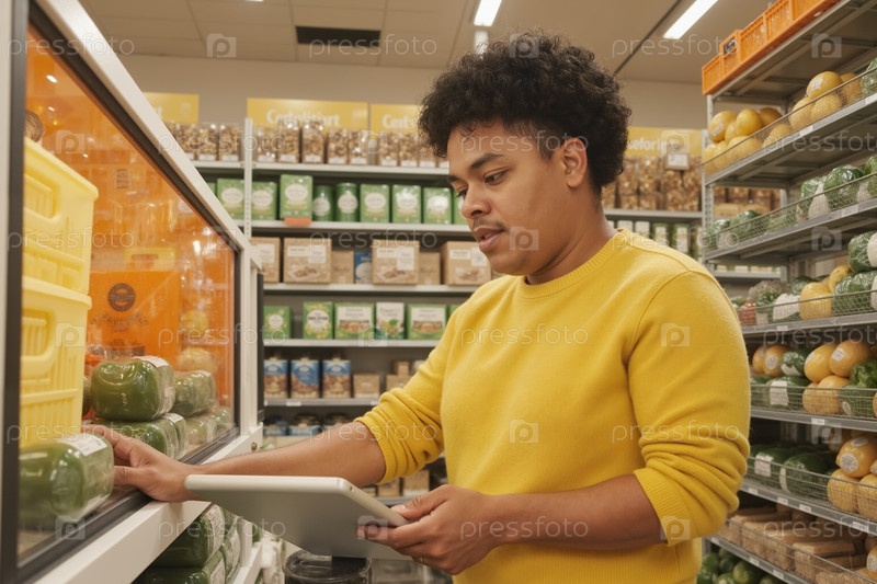 Черный мужчина использует цифровой планшет во время проверки продуктов в супермаркете