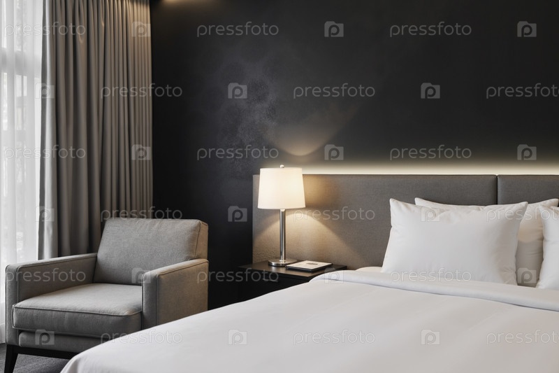 Интерьер гостиничного номера с постельным креслом и освещенным ночным столом