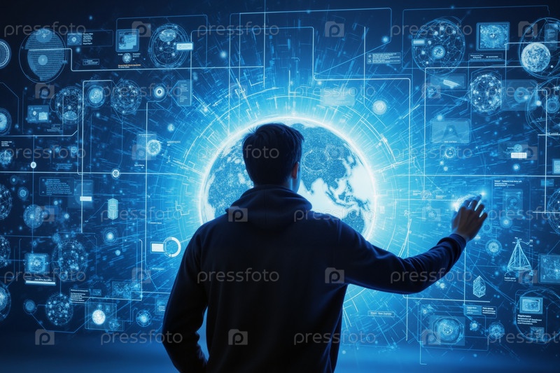 Человек взаимодействует с футуристическим интерфейсом цифрового мира