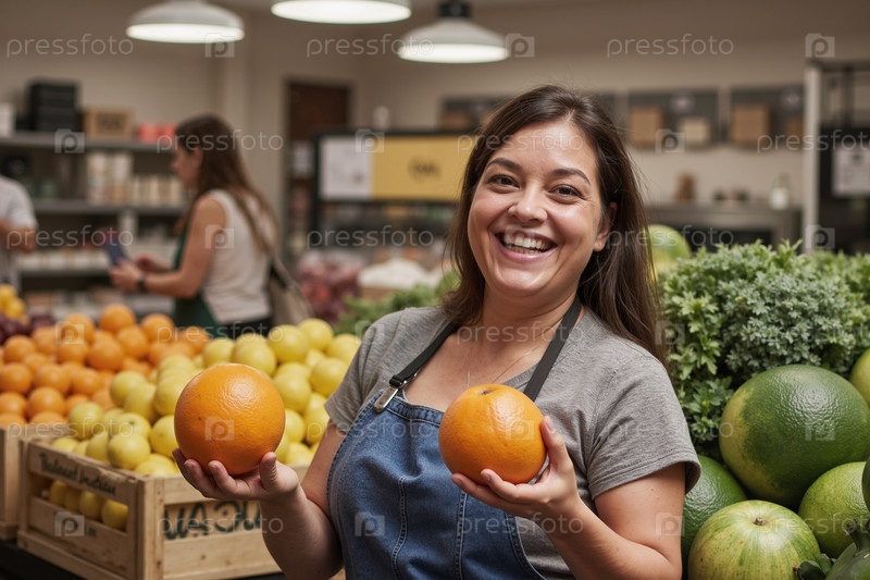 Портрет женщины, улыбающейся в то время как она держит апельсины внутри