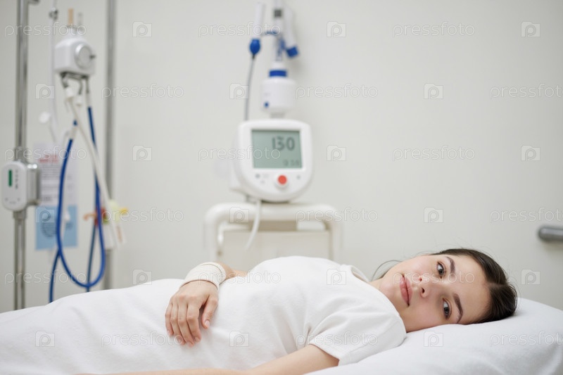 Лежащая в больничной постели женщина, подвергающаяся лечению