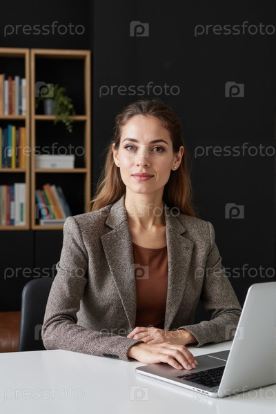 Портрет женщины, сидящей за рабочим столом и использующей ноутбук