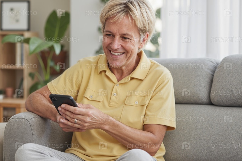 Женщина среднего возраста улыбается, используя смартфон в помещении