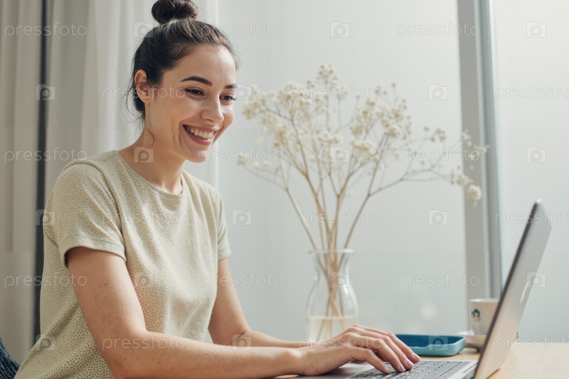 Женщина улыбается, используя ноутбук в яркой современной комнате