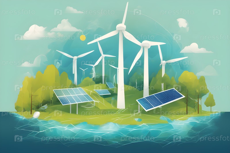 Иллюстрация концепции чистой энергии.Возобновляемые источники энергии, чистые технологии и устойчивое будущее