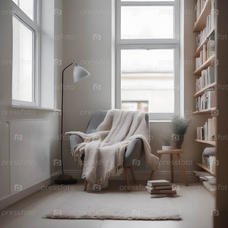 Интерьер читального угла в скандинавском стиле с удобным стулом и уютным одеялом, книжной полкой