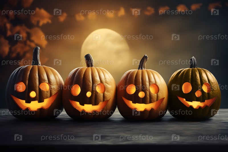 Хэллоуинские тыквы в ряд на деревянном столе против полнолуния и мрачного освещения темных облаков и осеннего листья (фон, копировальное пространство)