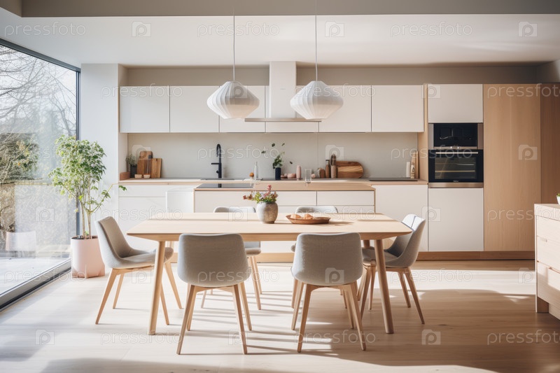 Интерьер уютной столовой с кухней в скандинавском стиле, деревянные стулья и стол, мягкое освещение, элегантный и скромный декор
