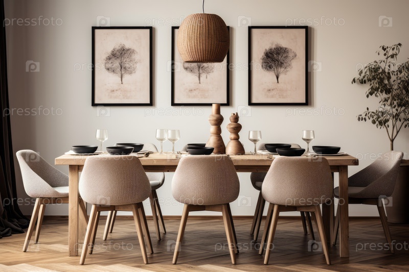 Интерьер уютной столовой в скандинавском стиле, деревянные стулья и стол, мягкое освещение, элегантный и сдержанный декор, скандинавские художественные принты