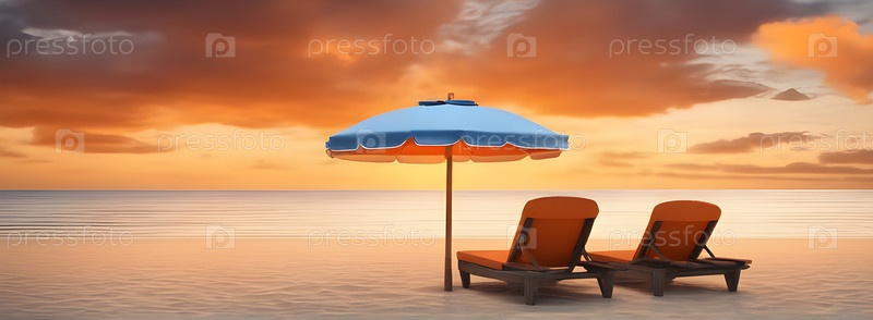 Панорамный вид двух шезлонгов под зонтиком на берегу песчаного пляжа, на фоне заката солнца, красивых оранжевых облаков (баннер, копировальное пространство)