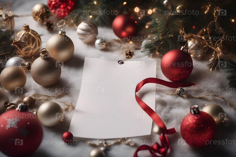 Близкий взгляд на красиво устроенные с искрящимися орнаментами рождественские украшения и пустые открытки для Санта-Клауса