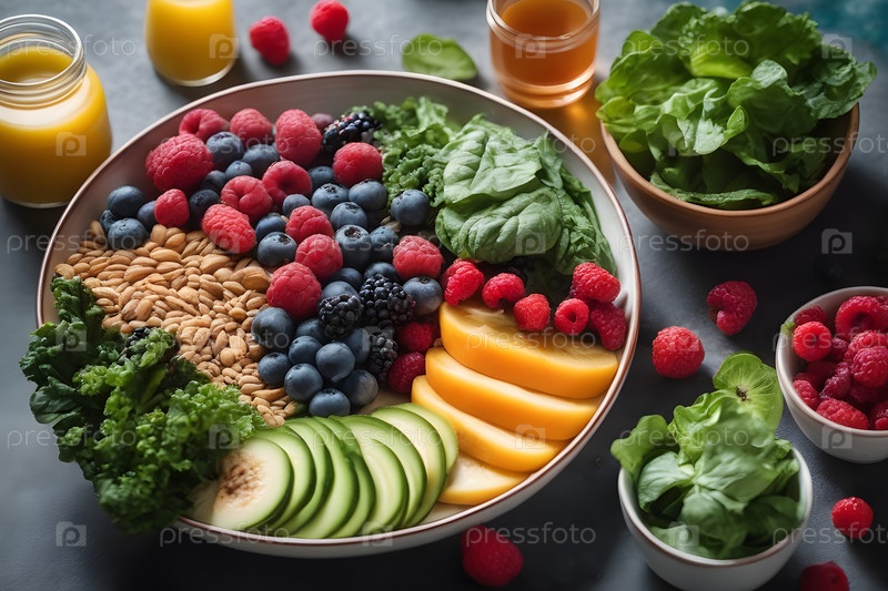 Красочная салатная миска, наполненная свежей зеленью, ягодами и орехами