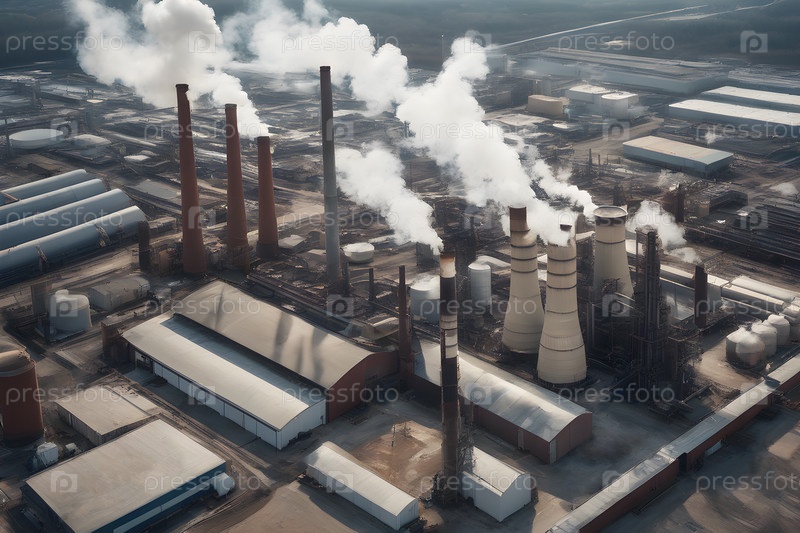 Вид с воздуха на внешность шумного промышленного объекта с дымоходами и оборудованием