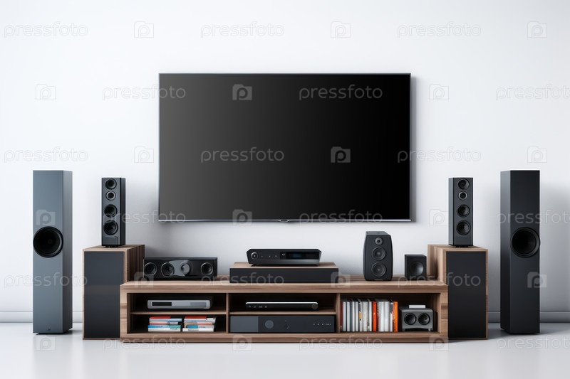 Фронтальный вид организованного развлекательного центра с потоковыми устройствами, умными телевизорами и беспроводными маршрутизаторами, демонстрирующими простоту и удобство технологии беспроводной связи