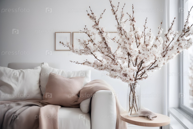 Интерьер стильной скандинавской гостиной с вазой и цветущими ветвями вишневых деревьев