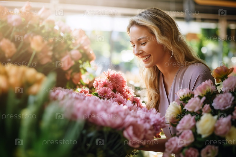 Красивая веселая женщина выбирает букет свежих цветов в цветочном бутике, избирательная ориентация, мелкая глубина поля зрения, портрет