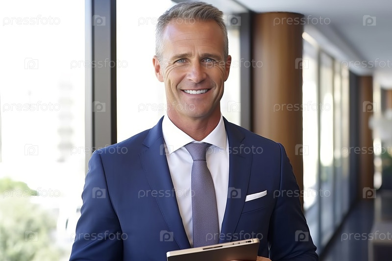 Улыбающийся бизнесмен средних лет в костюме, стоящий в офисе с помощью цифрового планшета