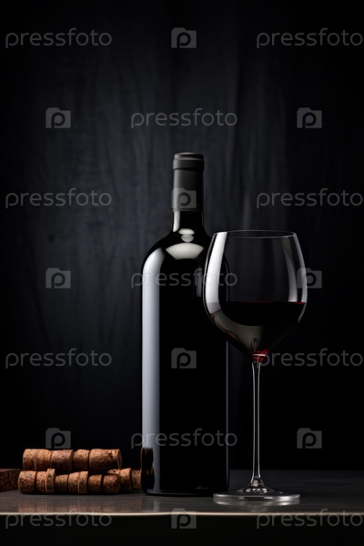 Черная бутылка без этикетки с бокалом вина и пробками, на темном фоне