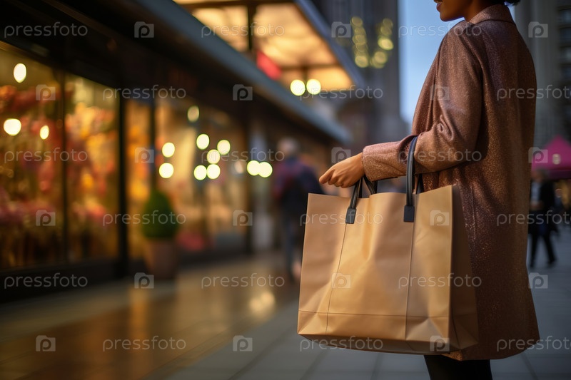 Закрытый вид бежевой сумки для покупок с пустым пространством расположения, которую держит стильная модель в шумной городской среде