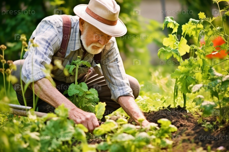 Пожилой человек в шляпе заботится о садовом участке с осторожностью, концепция садоводства