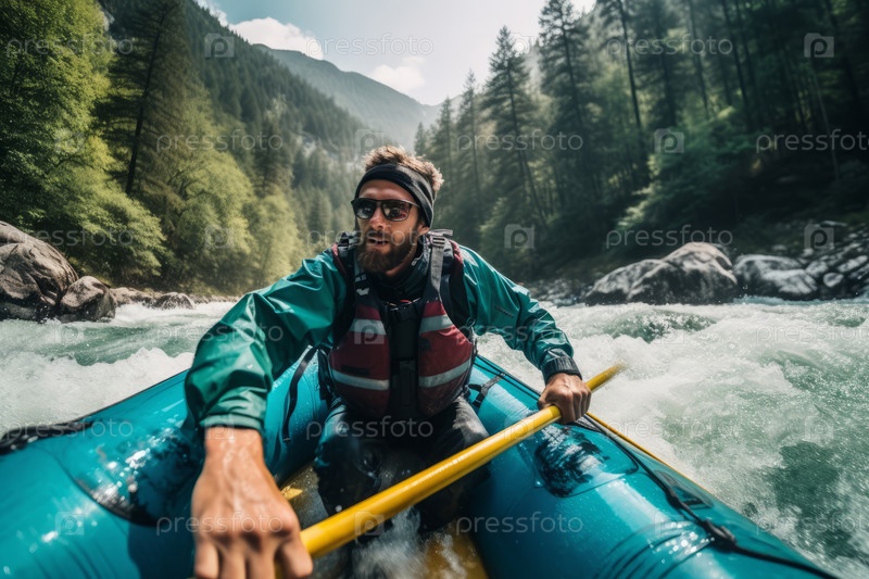 Вид на туристское рафтинг вдоль скалистой горной реки, каякинг, передает дух приключений и опасности