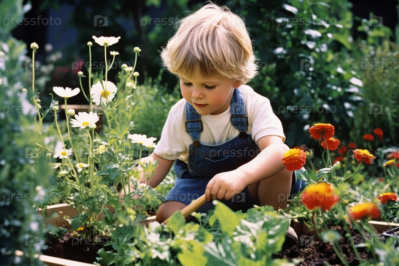 Маленький мальчик на садовом участке, заботящийся о растениях, концепция садоводства