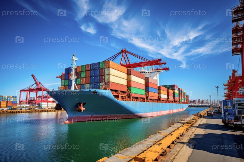 Огромный грузовой корабль пришвартовался в оживленном порту, с высокими стопами красочных судоходных контейнеров, иллюстрирующих масштабы глобального грузового транспорта