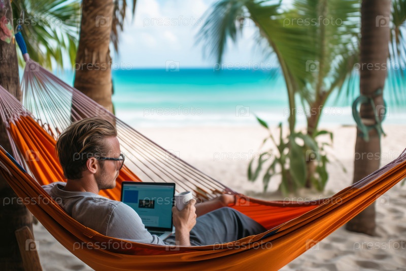Концепция самостоятельного путешествия с участием человека с ноутбуком, работающего из гамака на тропическом пляже, удаленная работа