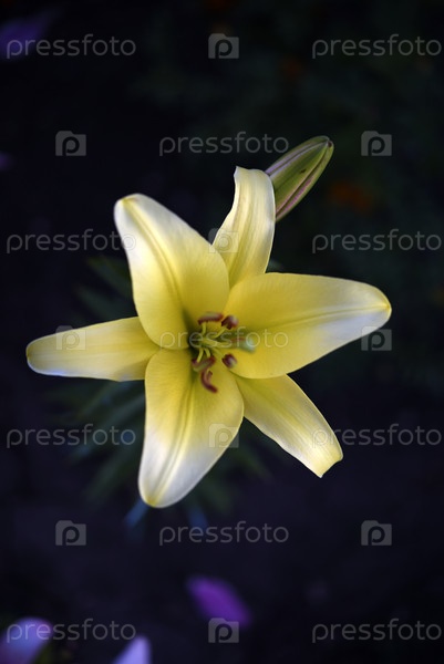 Светло-желтый цвет лилии на темном фоне. светлый цветок в темном саду. лилия