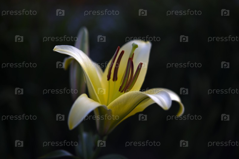 Светло-желтый цвет лилии на темном фоне. светлый цветок в темном саду. лилия