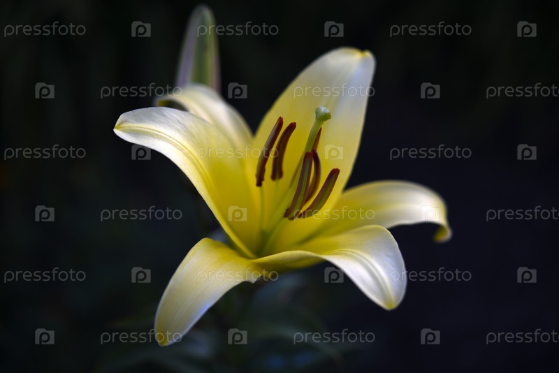 Светло-желтый цвет лилии на темном фоне. светлый цветок в темном саду. лилия