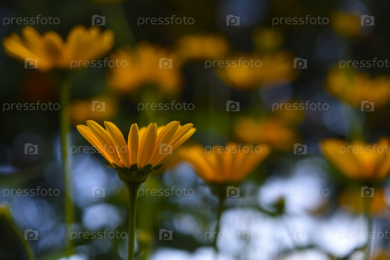 Желтые ромашки в свете.Жёлтые цветы на стороне.Прекрасный фон размытый