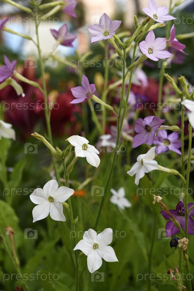 Красочные цветы декоративного табака. Nicotiana Alata. Садовый табак. Рассеянность цветов в саду
