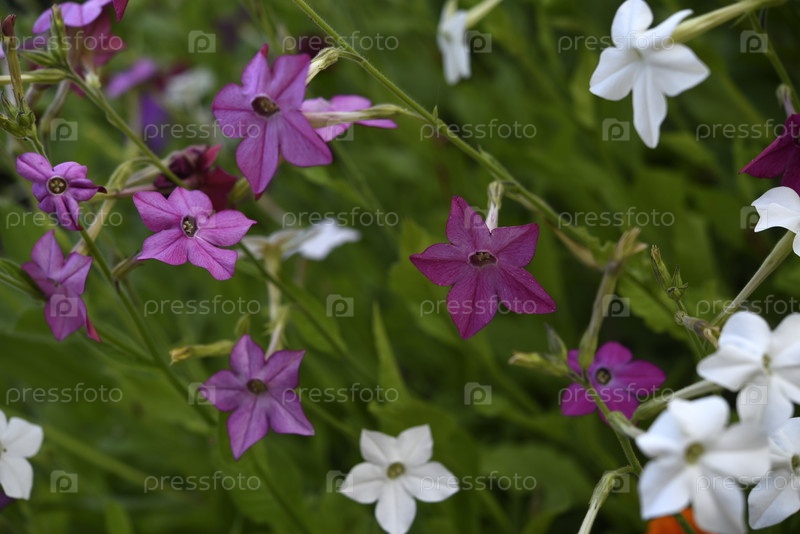 Красочные цветы декоративного табака. Nicotiana Alata. Садовый табак. Рассеянность цветов в саду