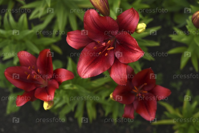 Красивые ярко-красные лилии в саду летом.Большой цветок