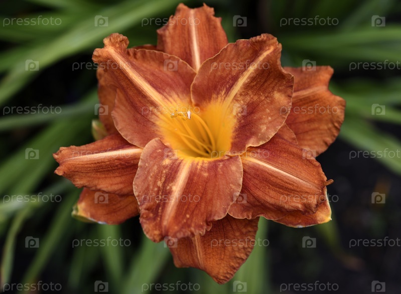 Оранжевые лилии с близкополосными полосками. Красивая желтая лилиники в саду летом. Большой цветок